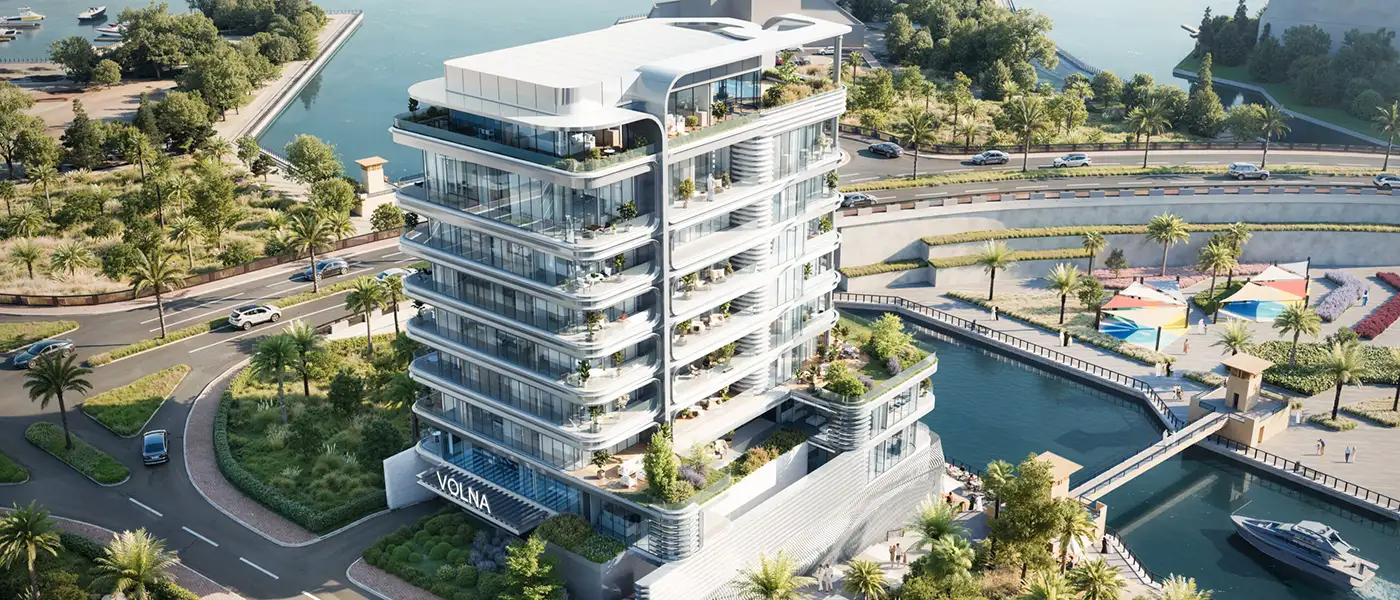 floor, 8 residential floors, and a rooftop terrace. The built-up area of this entire complex is over 6,000 sq. ft. and houses three exclusive studio units. When it comes to customization of interiors and premium finishing, each detail has been well-laid in each unit. With private balconies that offer sweeping views, these sunlit residences are designed with premium materials for comfort and luxuries you deserve. Along the scenic shorelines, Volna ensures impeccable connectivity to some of the most iconic attractions Dubai has. It will only take a quick 14-minute drive to reach Dubai Mall, and it will take you a 26-minute drive to Palm Jumeirah and 25 to Burj Al Arab. Only 30 minutes' drive away from setting foot on The Walk JBR's fun waterfront, which will then easily connect you to the city's best leisure spots. In addition, the property is within easy reach for Dubai International Airport within 9 minutes, while Al Maktoum International Airport is only 45 minutes away. In terms of amenities, there are many of those to make living here more enriching and satisfying. Experience the grandeur set around an infinity swimming pool and feel one with the surrounding natural scenery. The development includes amenities such as direct beach access, dedicated kids’